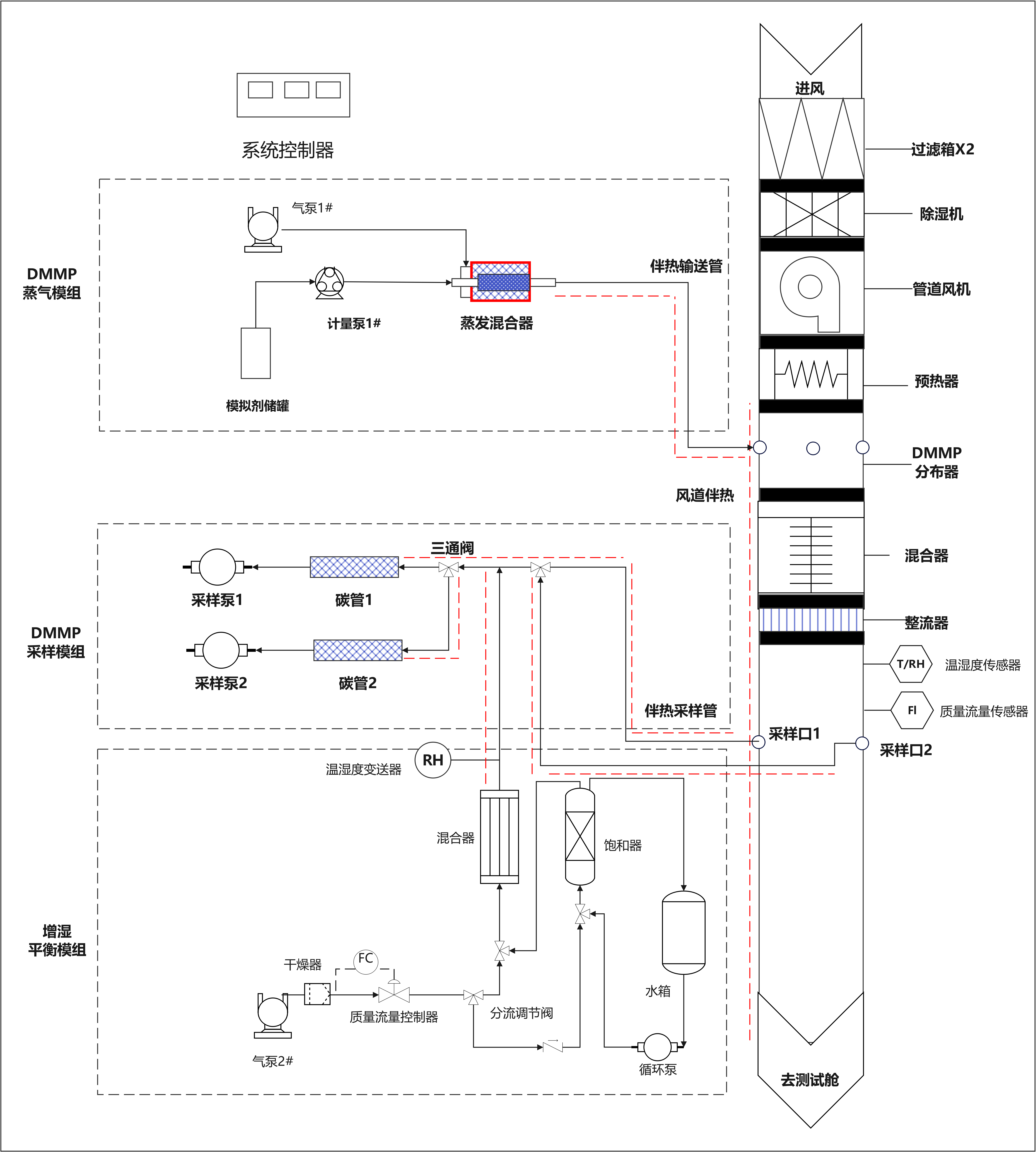 发生器由DMMP蒸发器、DMMP伴热输送管(头)、DMMP伴热采样管、增湿平衡气发生器等子系统组成。